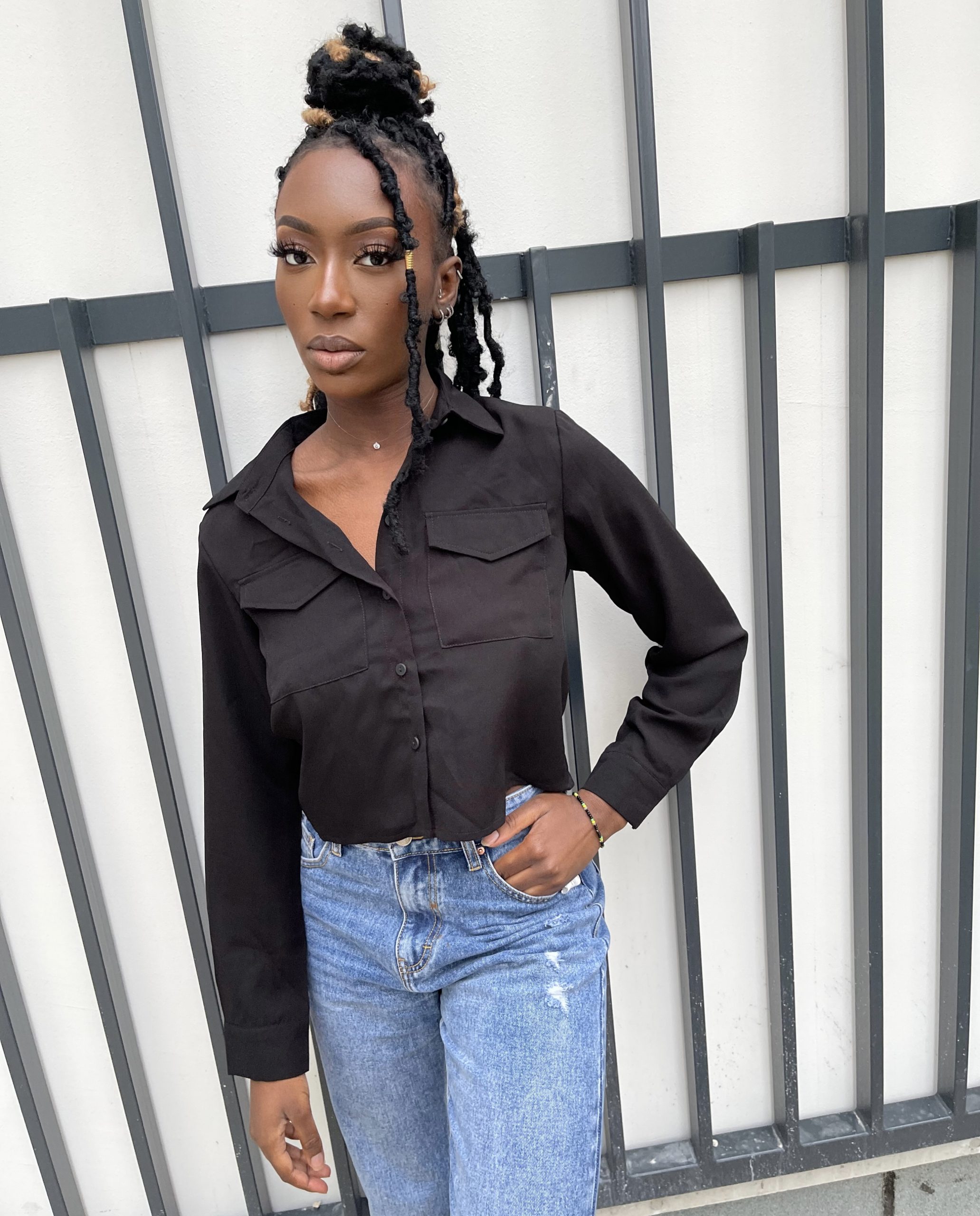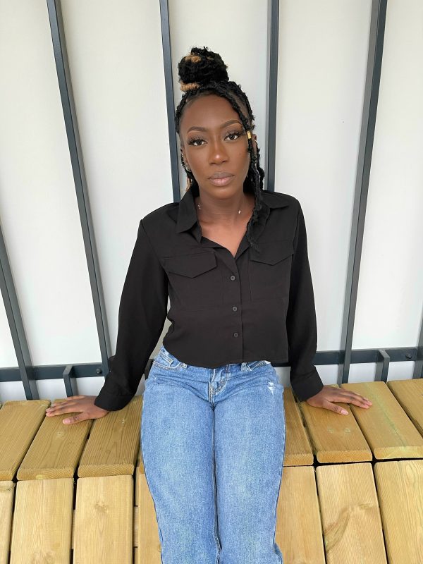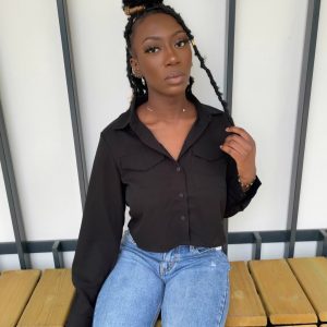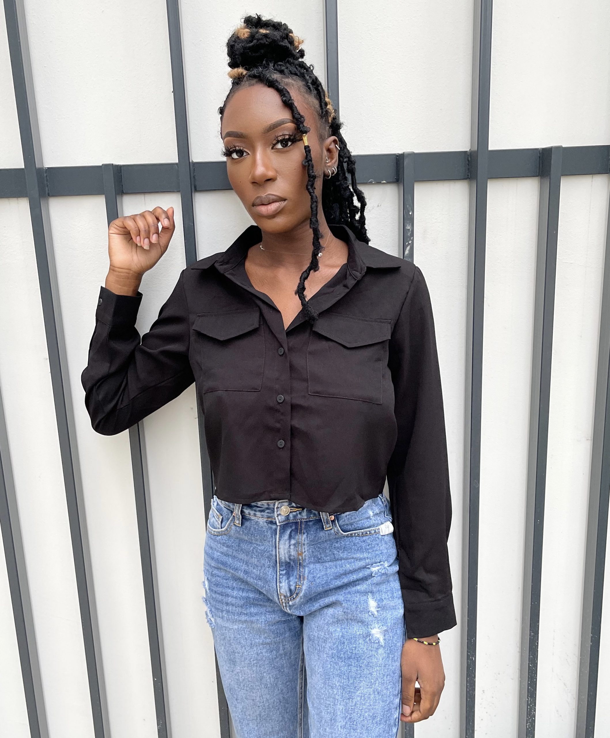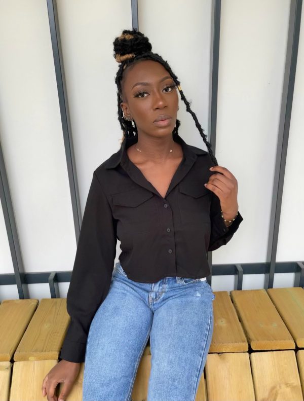 Trop belle dans cette chemise à la coupe courte canon. On aime son coloris noir et super élégant que l’on porte avec un jean et une paire de mules, tout simplement.