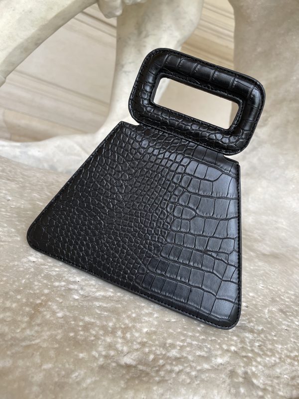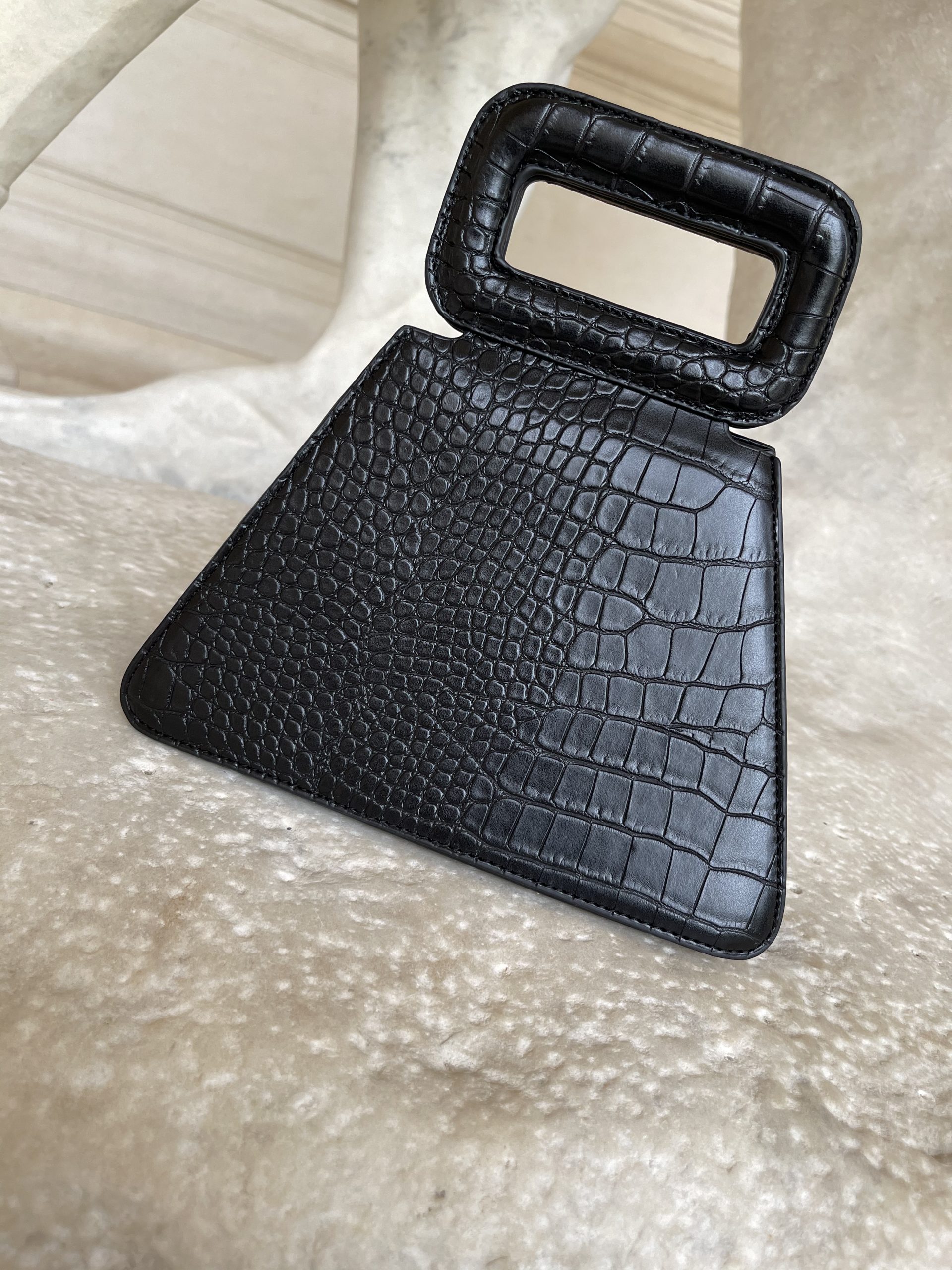 Ce mini sac est l’accessoire à avoir pour apporter de la modernité, du style à vos look avec son design triangulaire et son noir en imitation croco indémodable, c’est parfait pour vous démarquer.