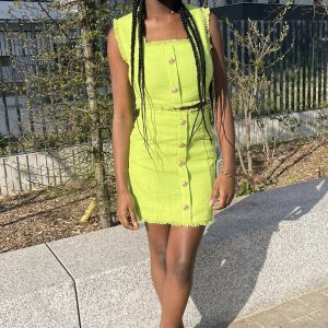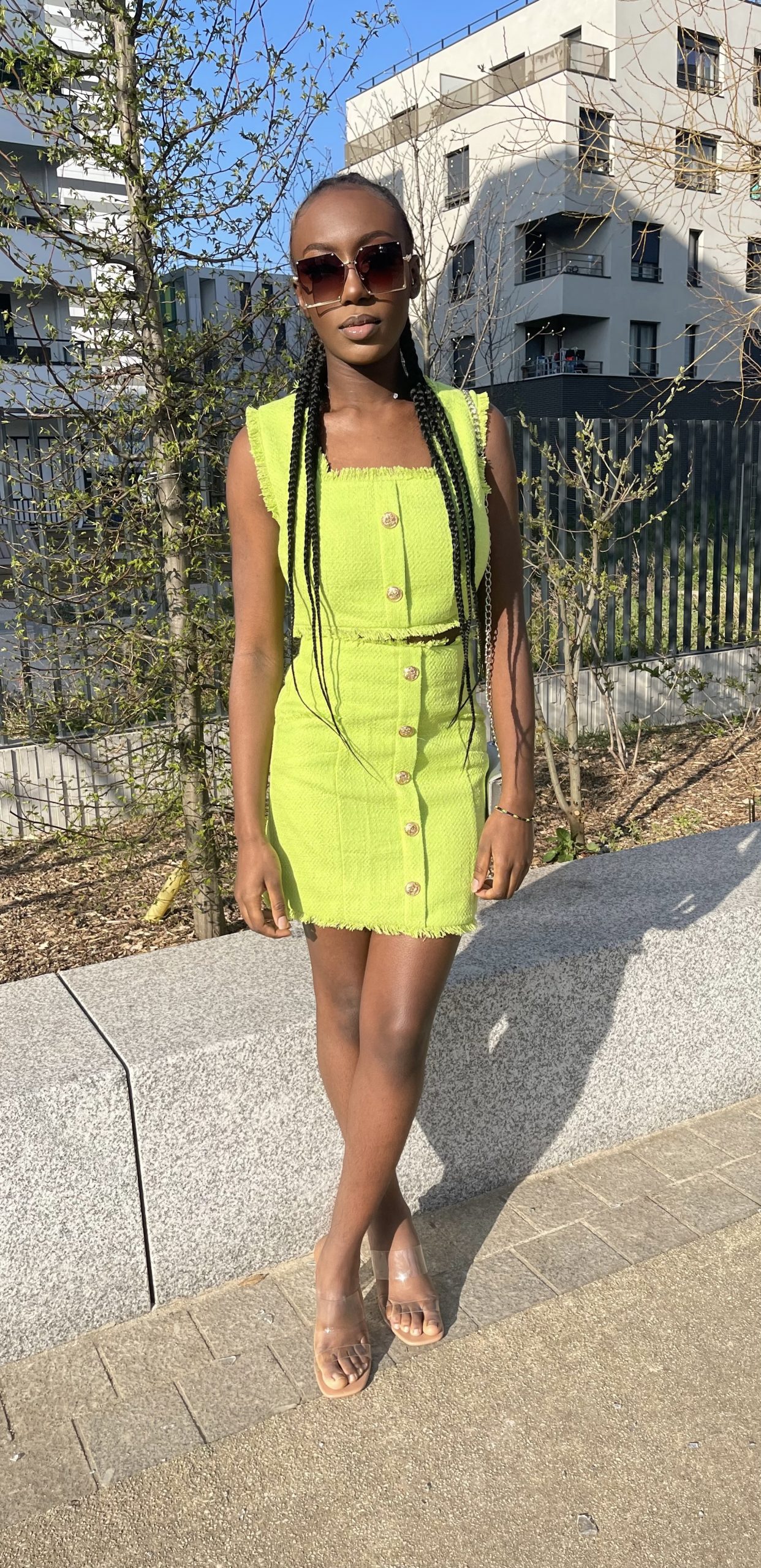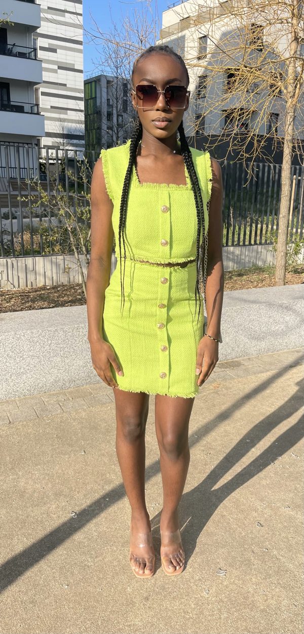 Totalement fans de ce top de couleur vert. On aime sa coupe courte que l’on porte avec sa jupe bien coupé, des mules et quelques accessoires.