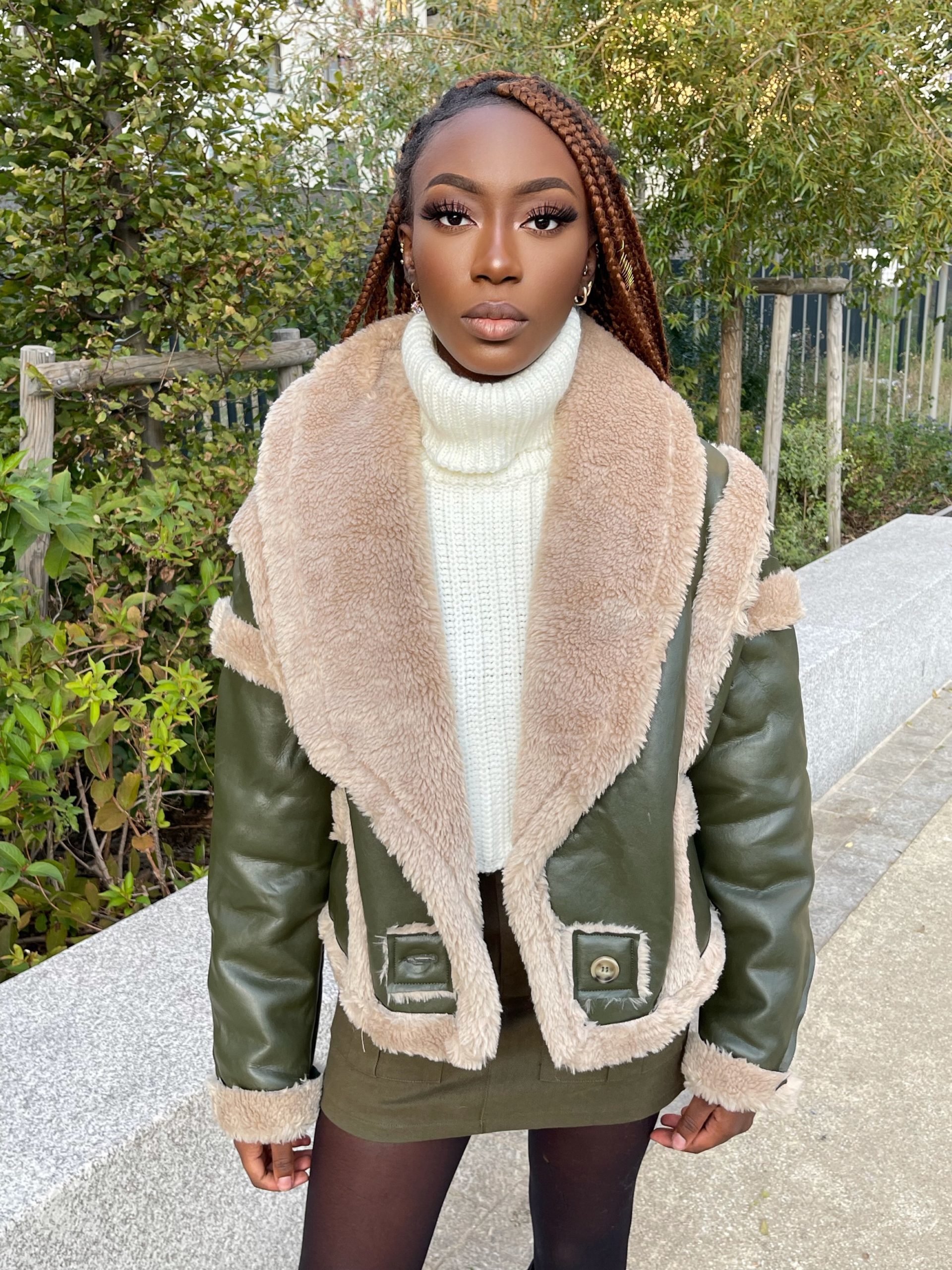 Cette veste est absolument incontournable avec sa matière similicuir, son coloris vert et sa coupe oversized, on la porte par-dessus tous nos outfit pour être toujours au top ! C’est notre alliée de l’automne/hiver.